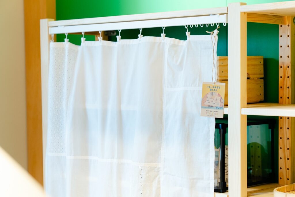 齋藤さん:私たちが主催する『めぐる布市』は布を素材のまま販売するリユースマーケットなので、作品に仕上げたものがお部屋にレイアウトされると、布の活用方法がイメージしやすくなっていいですね。展示のカーテンは、いわゆるカーテン分の尺がないハギレを、韓国の伝統工芸、ポジャギ風にパッチワークしたものです。こうして暮らしの空間にレイアウトされると改めて素敵だと感じました。これを見て、お家で眠っているハギレを思い出して活用してくれる人が増えたら嬉しいです。