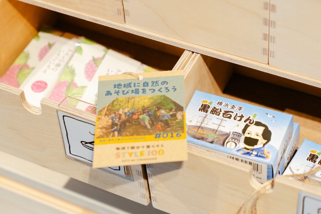 引き出しを開けると現れる横浜金澤黒船石鹸。これは瀬ケ崎小学校の児童の発案により、給食で廃棄されるみかんの皮をアップサイクルして製造された商品です。詳しくはSTYLE#016「地域に自然のあそび場をつくろう」をご覧ください。