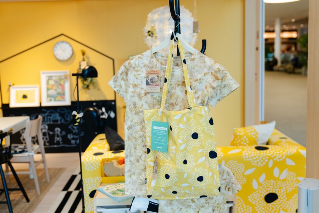 ハンガーに掛けられているのは、シェアフラワーで作った染料で染めたTシャツ。こちらはSTYLE#020「シェアフラワーで花と幸せを循環させよう」で紹介されています。エコバッグは不要になったエコバッグをお客さんから回収して、必要とするお客さんに貸し出すパタゴニア横浜・関内「エコバッグシェアリング」の取組。詳細はSTYLE#029「ごみを出さないお店をつくろう」でご覧ください。