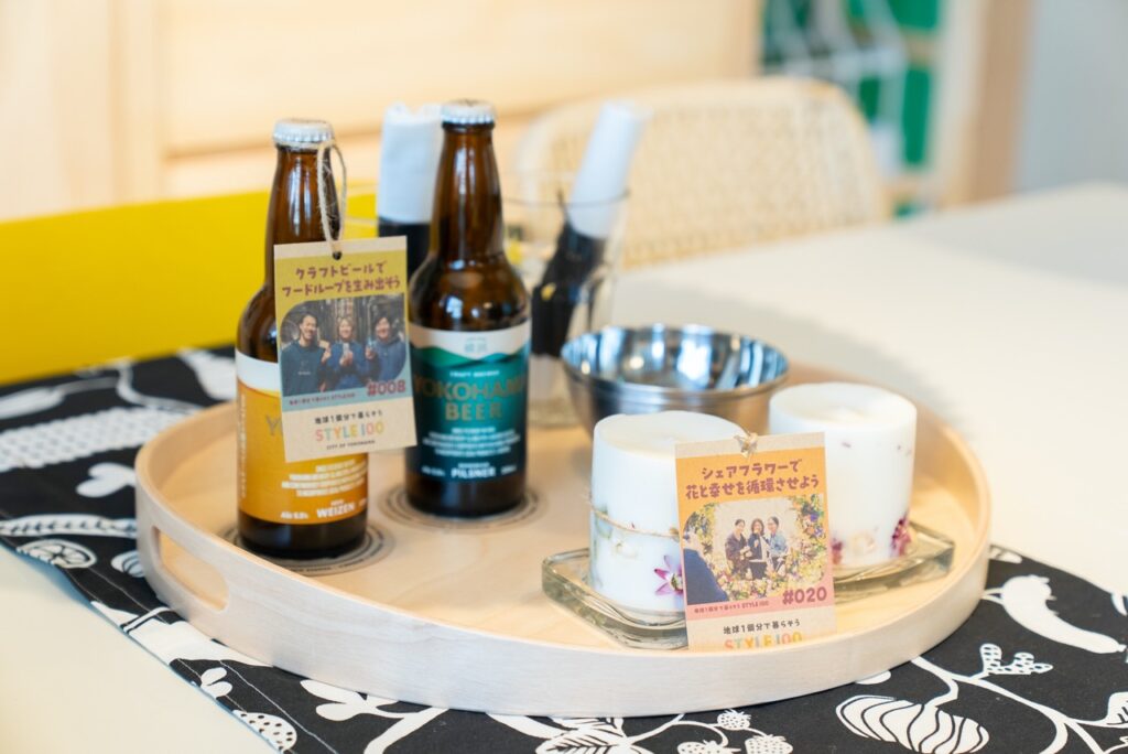 STYLEゆかりのアイテムだけではなく、レイアウトに用いられたイケア製品も、家具をはじめインテリア雑貨、ぬいぐるみに至るまですべてサスティナビリティを意識したもの。また、各アイテムに取り付けられたタグもクラフトビール製造時に排出されるモルト粕を使った再生紙で制作されています。