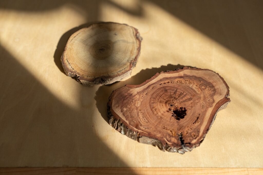 伐採材を15㎜ほどの厚さにカットし、地域作業所で木目がきれいに見えるよう研磨されたコースター。自分の作ったものが社会に評価される喜びを感じてもらえたのが嬉しいと石井さん。